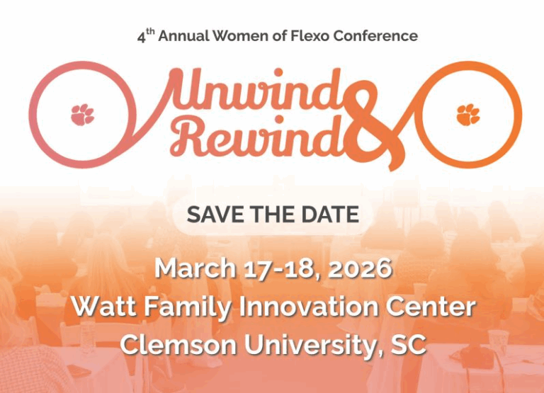Join us at Clemson University for the fourth annual Women of Flexo Conference, where we’ll unwind to connect, reflect, and recharge, and rewind to the fundamentals that drive innovation in flexographic printing. This year’s event celebrates both momentum and mindfulness: looking back to move forward stronger. You will gain industry insights, expand your networks, and experience exclusive tours of Clemson’s Sonoco Institute and Watt Family Innovation Center, offering a behind-the-scenes look at cutting-edge flexo research and technology shaping the future of our field.